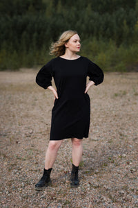 Description: The stylish and playful Natalia dress delights with its comfort and puffy sleeves. By changing accessories and shoes, the Natalia dress is suitable for many situations; for festive occasions, travel, work and leisure. Dress up with tights, boots and lipstick for dinner dates or with leggings and knitwear for a more casual occasion.