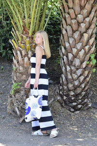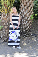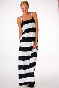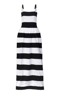 Description: Maxi dress with a fitted smocked bodice in a black and wide stripes. Straight skirt.