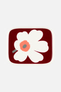 Description: The small rectangular Oiva plate is made of white stoneware, and it features the Unikko pattern. The plate is dishwasher, oven, microwave, and freezer safe.