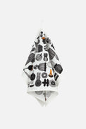 Description: The Puutarhurin Parhaat pattern tea towel is made of a cotton and linen blend, and it is printed in Helsinki. The tea towel has a green picot edge finish and a hanging loop on the long edge.