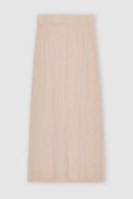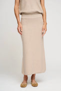 Description: Light A-line knitted skirt in pearl structure with midi length, fine ribbed edge, and a decorative slit. The skirt is designed to sit at the waist and also features an elastic waistband for a comfortable fit.