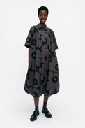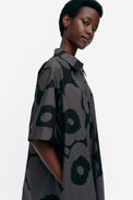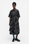 Description: The Popliini shirt dress is made of organic cotton poplin, and it has a relaxed, A-line fit. The dress is printed in the Unikko pattern. It has a pointed collar, a button closure, side seam pockets, and short sleeves with cuffs. The dress has a curved hem, and it comes with a separate D-ring belt.