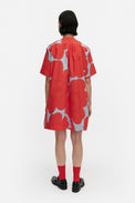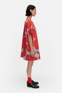 Description: The Taitavuus dress has a relaxed, A-line fit and it features the Unikko pattern, which is printed in Helsinki. The dress has an O-neck, a button closure, and a gathered yoke seam in the back. The elbow-length sleeves are loose and there are pockets in the side seams.