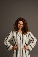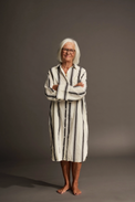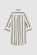 Description: Striped shirtdress in an oversized fit with full button closure. The shirtdress features a classic shirt collar, chest pocket, and wide cuffs. Note the subtle pleat at the back, curved hemline, and side slits, which give the shirt a beautiful drape.