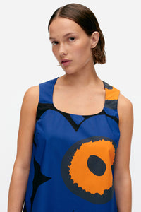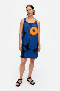 Description: The Kestit dress is made of organic cotton twill, and it has a slim, A-line fit and the Unikko pattern, which is printed in Helsinki. The product contains 4% elastane. The sleeveless dress has an open square neckline, a concealed zipper in the back seam, and side seam pockets.br/>