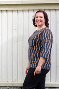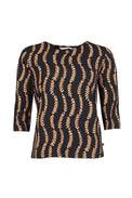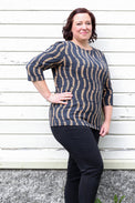Description: Casual Fiia is a classic t-shirt, now in beautiful vine-patterned fabric. Round neckline. 3/4 sleeves. Shirt length for upper hip. Loose fit.