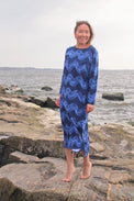 Description: Full length striped nightdress with ribbed neckline and bracelet length sleeves with ribbed cuffs. Hits approximately above the ankle with side slit at the hemline.