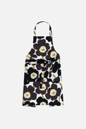 Description: Cotton apron features the classic Pieni Unikko pattern. One front pocket, an adjustable neck strap and bands at the waist that can be tied together at the back.